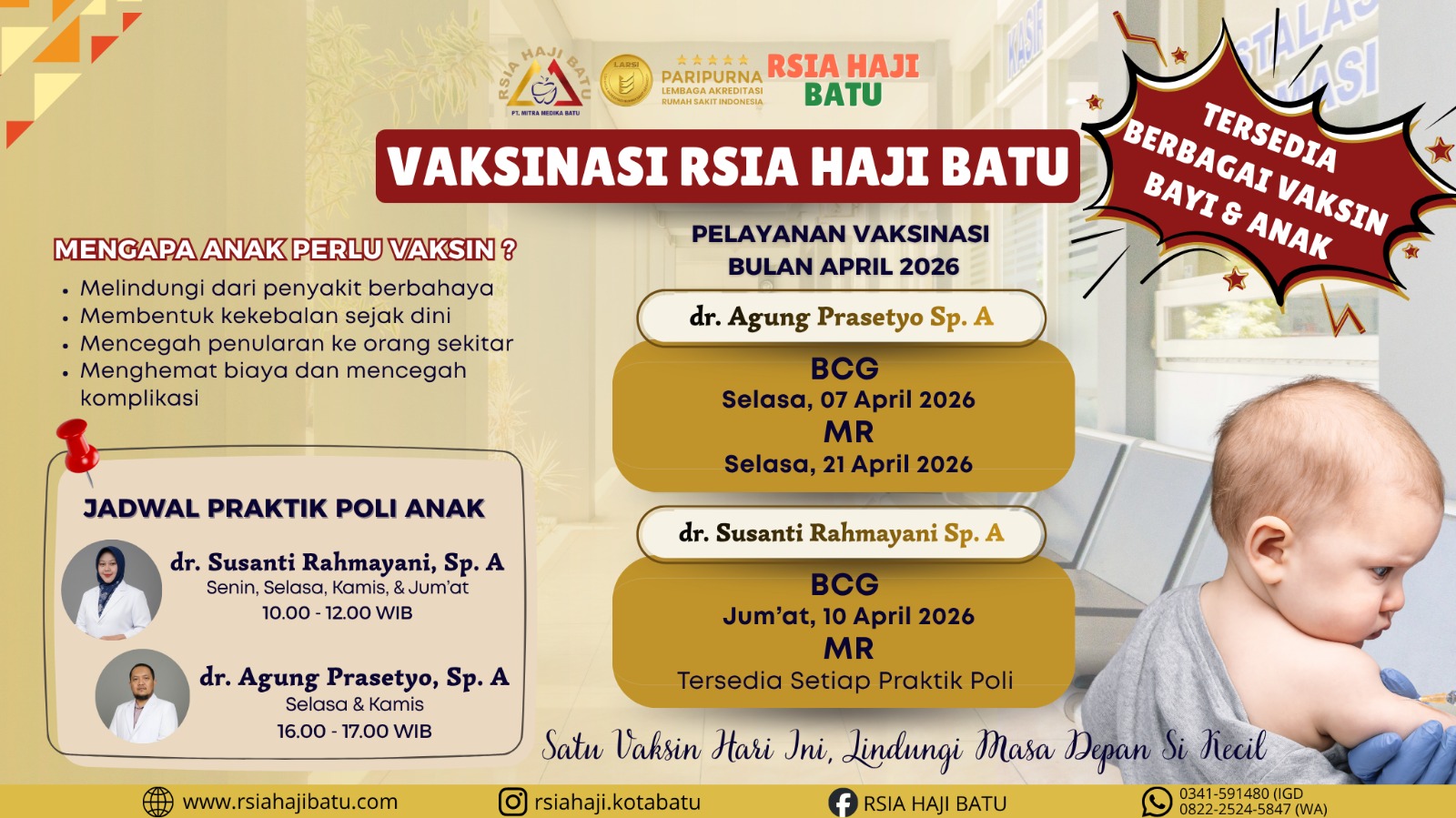 Poli Anak melayani vaksinasi untuk anak dengan tujuan memberikan perlindungan optimal terhadap penyakit yang dapat dicegah sejak dini. Pada jadwal vaksinasi ini tersedia vaksin BCG dan vaksin MR (Measles dan Rubella) yang sangat penting untuk mendukung kesehatan dan tumbuh kembang anak. Pelayanan vaksinasi dilakukan oleh Dokter Spesialis Anak, yaitu dr. Agung Prasetyo, Sp.A dan dr. Susanti Rahmayani, Sp.A, yang berpengalaman dalam memberikan perawatan kesehatan anak secara menyeluruh. Proses vaksinasi dilakukan dengan memperhatikan standar medis serta kenyamanan anak dan orang tua. Orang tua diimbau untuk membawa buku KIA atau kartu imunisasi saat berkunjung ke Poli Anak agar pencatatan vaksin dapat dilakukan dengan baik. Untuk informasi jadwal dan pendaftaran bisa di cek melalui nomor whatsapp kami 0822-2524-5847. RSIA Haji BatuJl. KH. Agus Salim No. 35, Kelurahan Sisir, Kecamatan Batu, Kota Batu, Jawa Timur (65314)Website: www.rsiahajibatu.comFacebook : RSIA Haji BatuInstagram : rsiahaji.kotabatuLayanan Pelanggan (WA): 0822-2524-5847