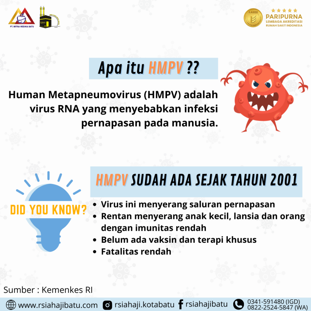Human Metapneumovirus (HMPV) adalah salah satu virus penyebab infeksi saluran pernapasan yang sering menyerang anak-anak, lansia, dan individu dengan sistem imun lemah. Gejalanya mirip dengan flu biasa, seperti batuk, pilek, demam, hingga sesak napas. Namun, pada beberapa kasus, terutama jika tidak ditangani dengan baik, HMPV dapat berkembang menjadi kondisi serius seperti bronkitis atau pneumonia.