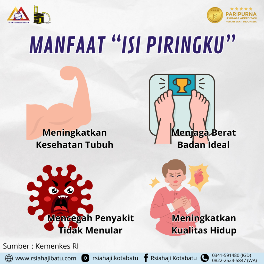 Isi Piringku” adalah panduan gizi seimbang yang sederhana namun sangat penting untuk diterapkan dalam kehidupan sehari-hari. Konsep ini dirancang untuk membantu masyarakat Indonesia memahami cara menyusun porsi makanan yang sehat dan memenuhi kebutuhan nutrisi harian. Dalam satu piring makan, setengahnya sebaiknya diisi dengan sayuran dan buah-buahan. Sayuran menyediakan serat, vitamin, dan mineral yang penting untuk melancarkan pencernaan dan menjaga fungsi tubuh. Sedangkan buah-buahan kaya akan antioksidan yang membantu meningkatkan daya tahan tubuh serta melindungi dari radikal bebas.