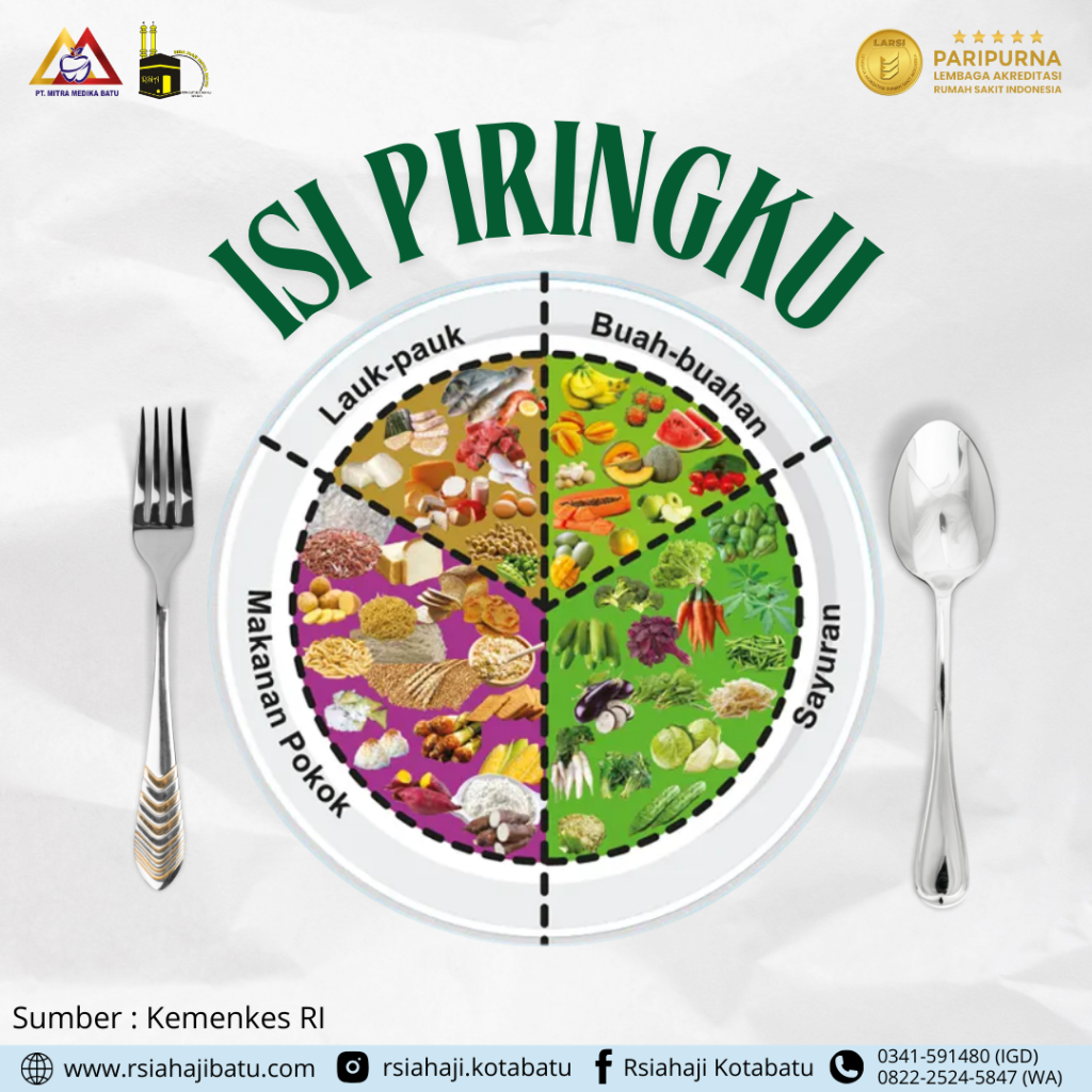 Isi Piringku” adalah panduan gizi seimbang yang sederhana namun sangat penting untuk diterapkan dalam kehidupan sehari-hari. Konsep ini dirancang untuk membantu masyarakat Indonesia memahami cara menyusun porsi makanan yang sehat dan memenuhi kebutuhan nutrisi harian. Dalam satu piring makan, setengahnya sebaiknya diisi dengan sayuran dan buah-buahan. Sayuran menyediakan serat, vitamin, dan mineral yang penting untuk melancarkan pencernaan dan menjaga fungsi tubuh. Sedangkan buah-buahan kaya akan antioksidan yang membantu meningkatkan daya tahan tubuh serta melindungi dari radikal bebas.