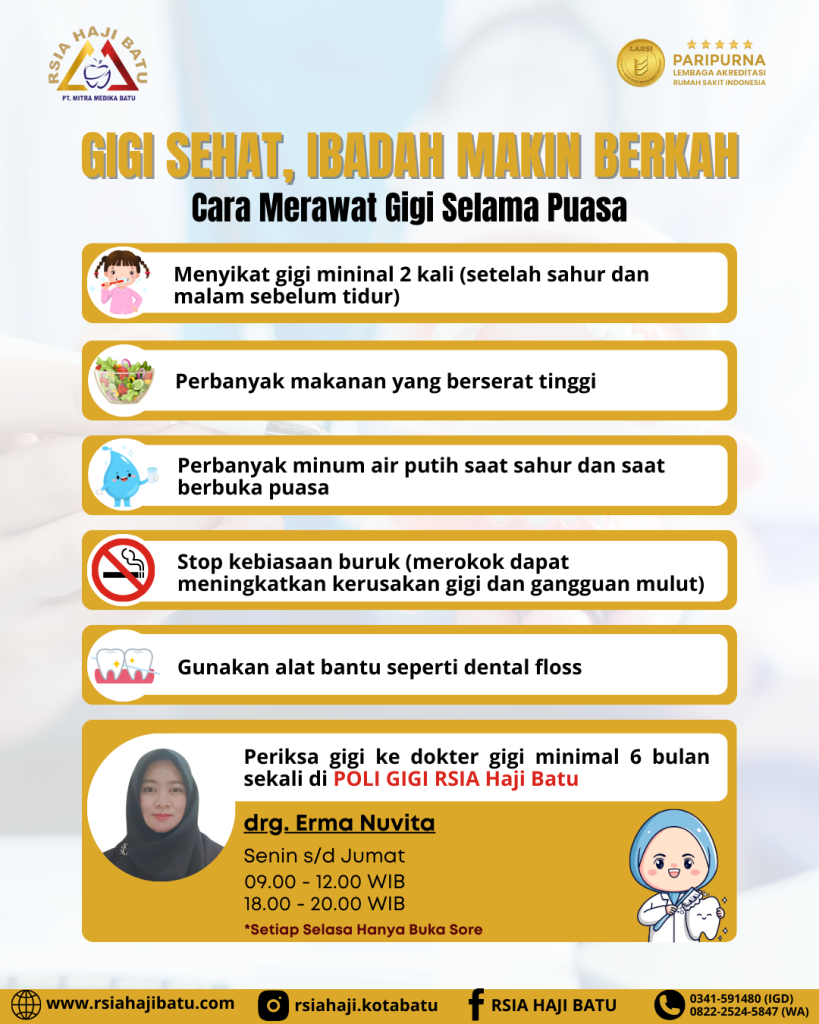 Jaga kesehatan gigi dan mulut selama puasa agar tetap segar sepanjang hari! ✨🦷 Jangan lupa sikat gigi setelah sahur & berbuka, gunakan benang gigi, dan perbanyak air putih. Hindari makanan manis berlebihan agar gigi tetap kuat dan napas tetap segar. Selamat berpuasa! 🌙💙 #SehatSaatPuasa #GigiSehat #RamadanBerkah