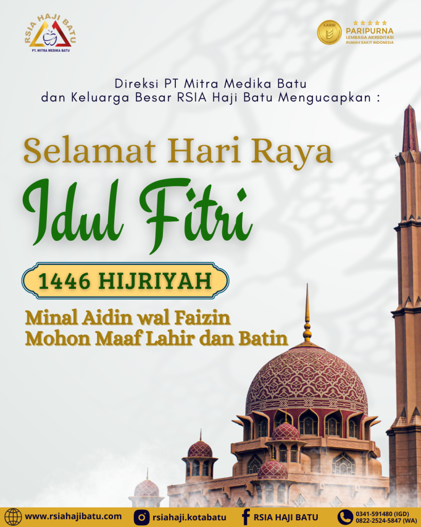Keluarga besar RSIA Haji Batu mengucapkan Taqabbalallahu minna wa minkum, taqabbal yaa karim. Semoga Allah menerima amal ibadah kita dan melimpahkan berkah serta keberkahan di hari yang suci ini. Di momen yang penuh kebahagiaan ini, mari kita saling memaafkan, mempererat silaturahmi, dan berbagi kebahagiaan dengan orang-orang tercinta.