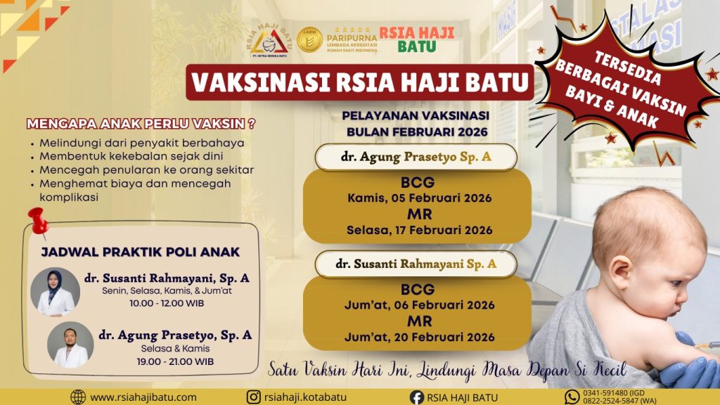 Orang tua diimbau untuk membawa buku KIA atau kartu imunisasi saat berkunjung ke Poli Anak agar pencatatan vaksin dapat dilakukan dengan baik. Untuk informasi jadwal dan pendaftaran bisa di cek melalui nomor whatsapp kami 0822-2524-5847.