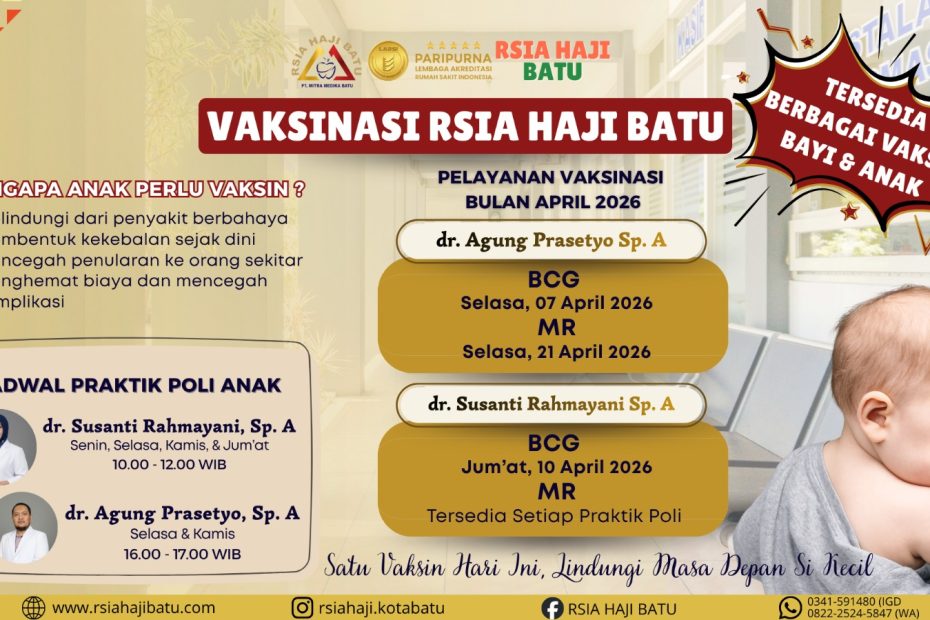 Poli Anak melayani vaksinasi untuk anak dengan tujuan memberikan perlindungan optimal terhadap penyakit yang dapat dicegah sejak dini. Pada jadwal vaksinasi ini tersedia vaksin BCG dan vaksin MR (Measles dan Rubella) yang sangat penting untuk mendukung kesehatan dan tumbuhPENGUMUMAN : INFORMASI JADWAL VAKSINASI BCG Dan MR POLI ANAK